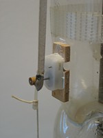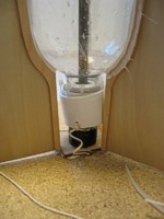 Kabelbindern geklebt, die von einem Stück Abflußrohr hinter den Tragering des Flaschenhalses geklemmt