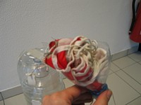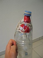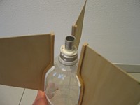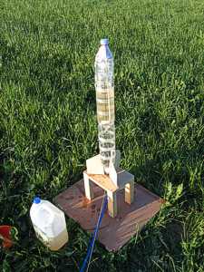 weitere, leichte Flasche (Wasser) zum Einsatz: Der untere Teil als Sockel auf dem Hals der Rakete, der obere bildet die Kappe für den Fallschirm. Der Sockel wird mit drei